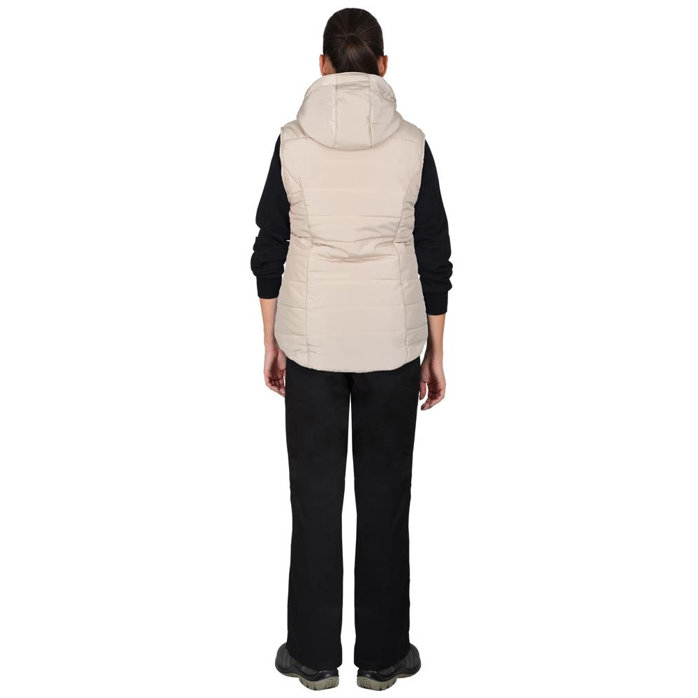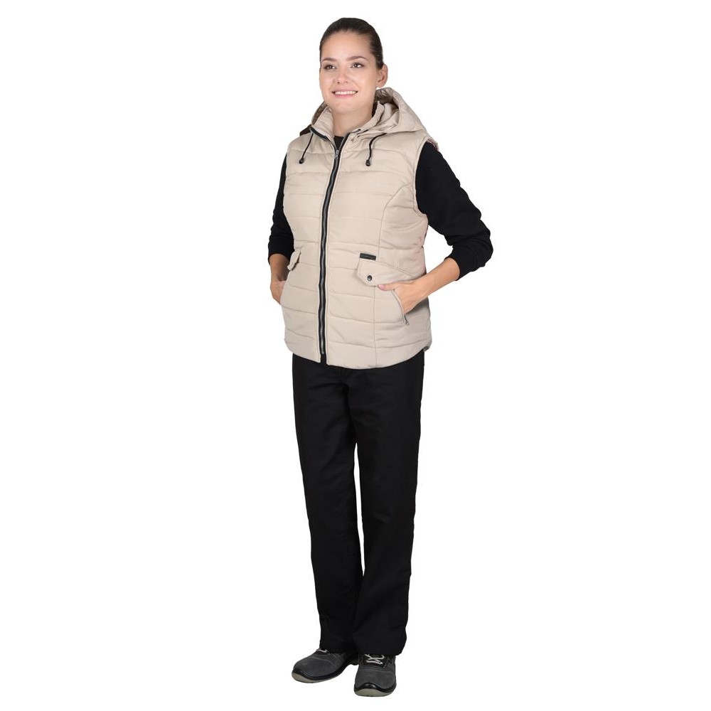 Жилет утеплённый, выстеган с утеплителем горизонтальными строчками, с центральной застёжкой на молнию. С воротником стойка и съемным утепленным капюшоном. Жилет с двумя нижними прорезными карманами, частично прикрытыми клапанами с кнопками. Нижняя часть проймы стянута эластичной тесьмой, для лучшего прилегания. Жилет с фигурной линией низа спереди и сзади.